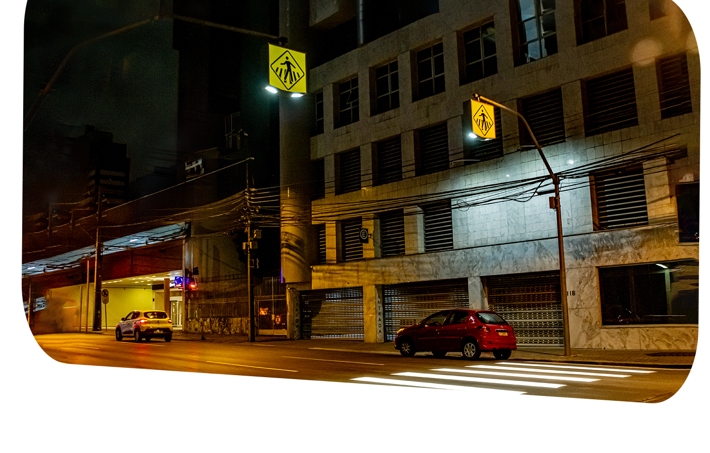 Consiste em um conjunto de equipamentos e softwares de última geração, sendo luminárias de travessia de pedestre com módulos de iluminação ativa